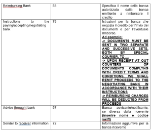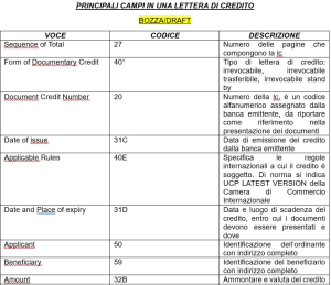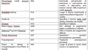 La lettera di credito viene emessa con messaggio swift MT700, inviato dalla banca emittente alla banca avvisante. Questo particolare messaggio contiene numerosi campi, alcuni dei quali obbligatori ed altri opzionali.